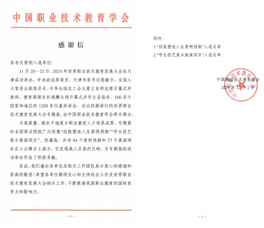 近日,我校收到一封来自中国职业技术教育学会发来的感谢信,文中提到文物保护考古学院和戏曲艺术学院参加2024年世界职业技术教育发展大会,为专题展成功举办作出了积极贡献,其中文物保护考古学院袁亚婷入选“技能塑造人生案例视频”,戏曲艺术学院歌曲联唱《国潮新唱》入选“学生技艺展示展演项目”。