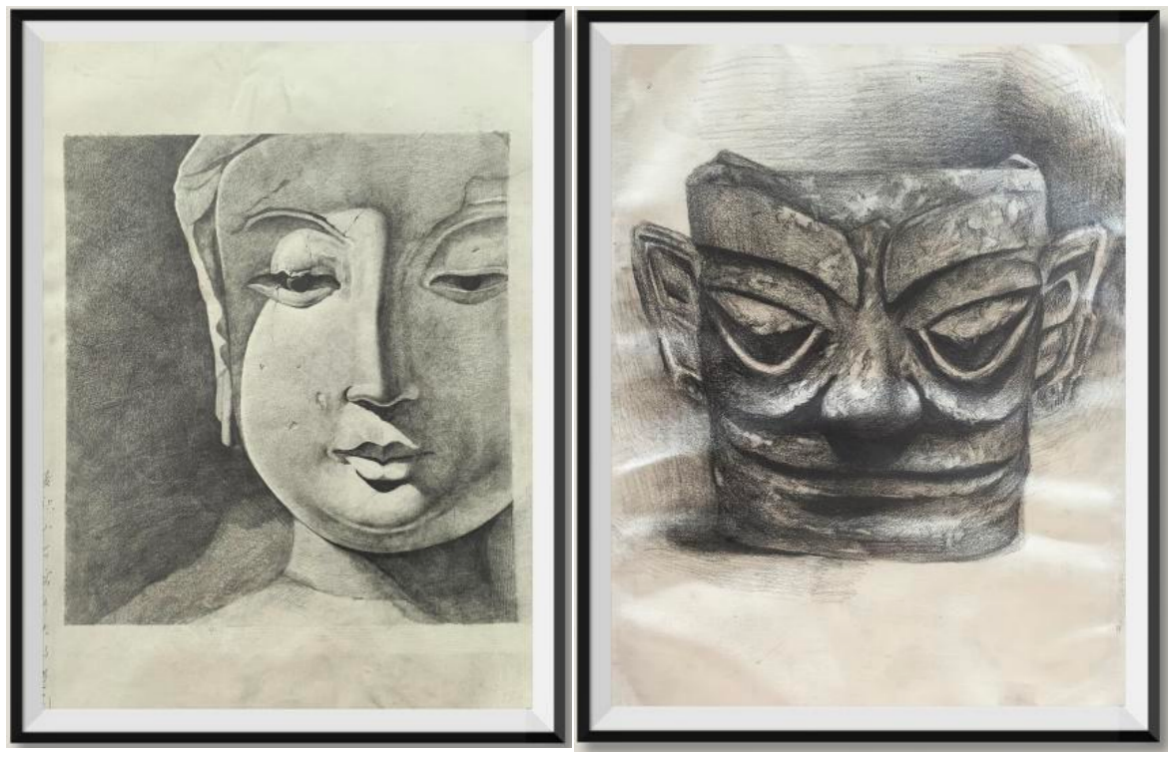 美术基础作为文物修复与保护专业的基础课程,着重培养学生造型、观察、动手与艺术审美能力。此次展出的素描、水粉、工笔等多种绘画作品,紧扣专业特色,学生们通过深入研究文物图片,探寻其历史渊源,与文化遗产展开跨时空对话,并以画笔生动再现文物风貌。这一过程不仅提升了学生的艺术塑造能力,更拓宽了他们的文物知识视野,展现出独特的艺术视角与创新思维。